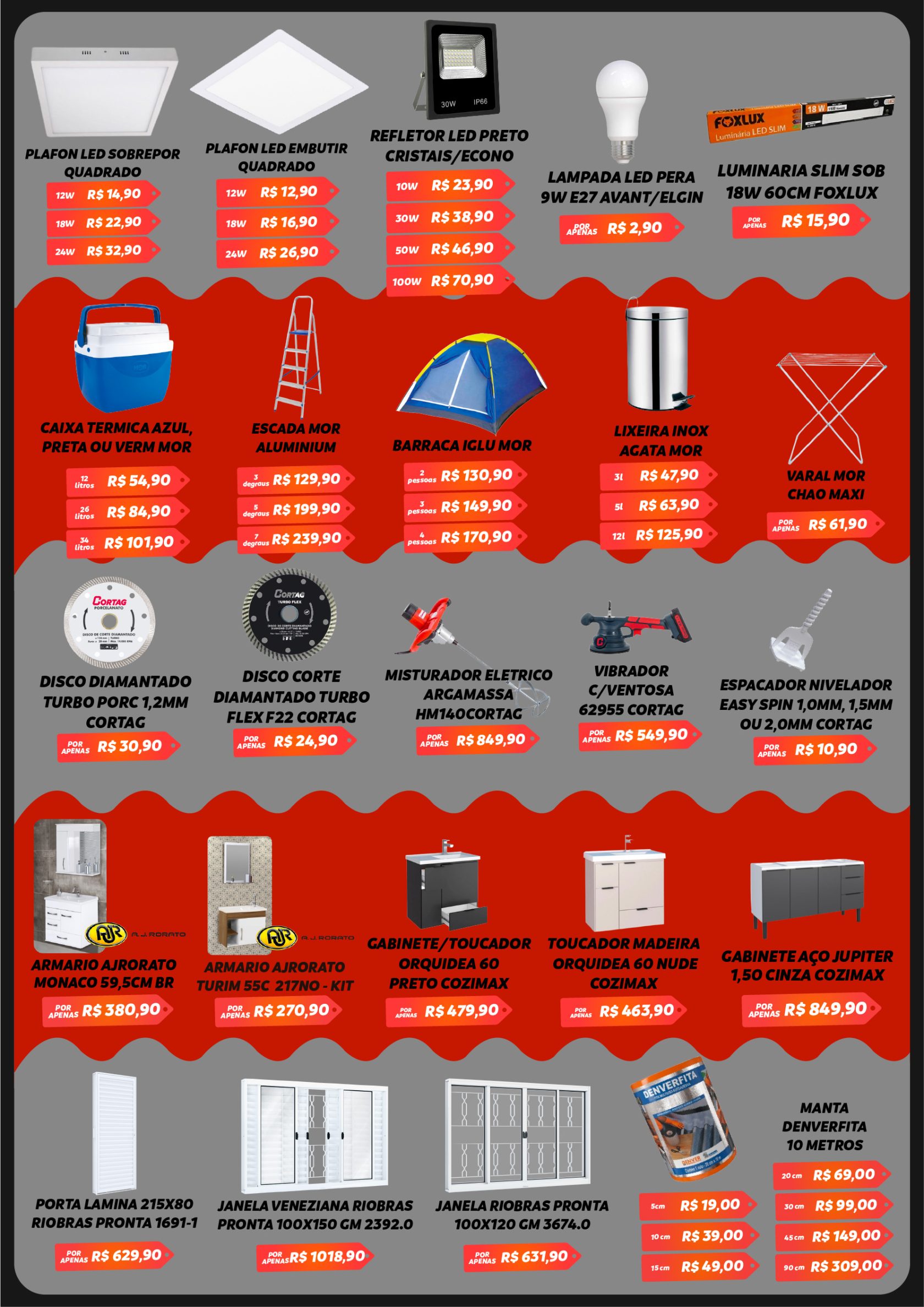 As nossas duas lojas, que somam 25.000 metros quadrados de área, disponibilizam o maior mix de materiais a pronta entrega da região, nos mais variados segmentos, como elétricos, iluminação, equipamentos de segurança, tinta, impermeabilizantes, pisos, porcelanatos, revestimentos, portas, janelas, hidráulicos, materiais brutos de construção, ferragens, ferramentas manuais e elétricas, jardinagem, lazer, cozinha, área de serviço, banheiro e organização da sua casa, tornando-se uma loja completa no segmento.