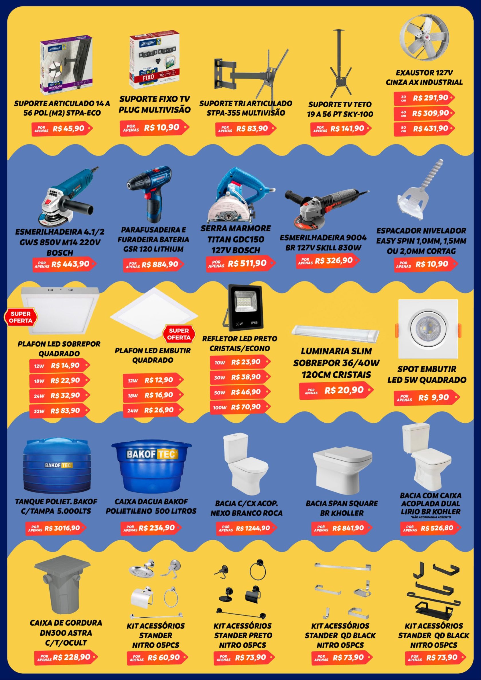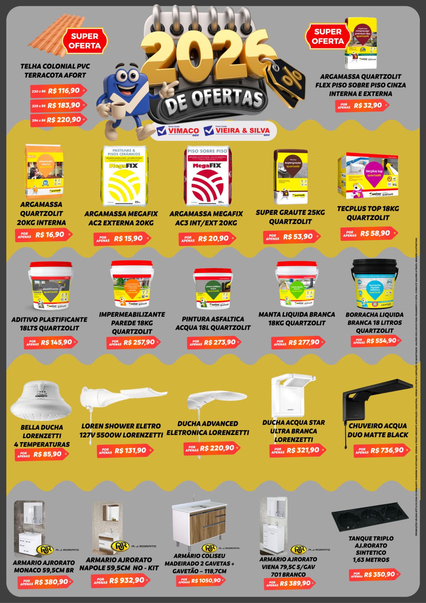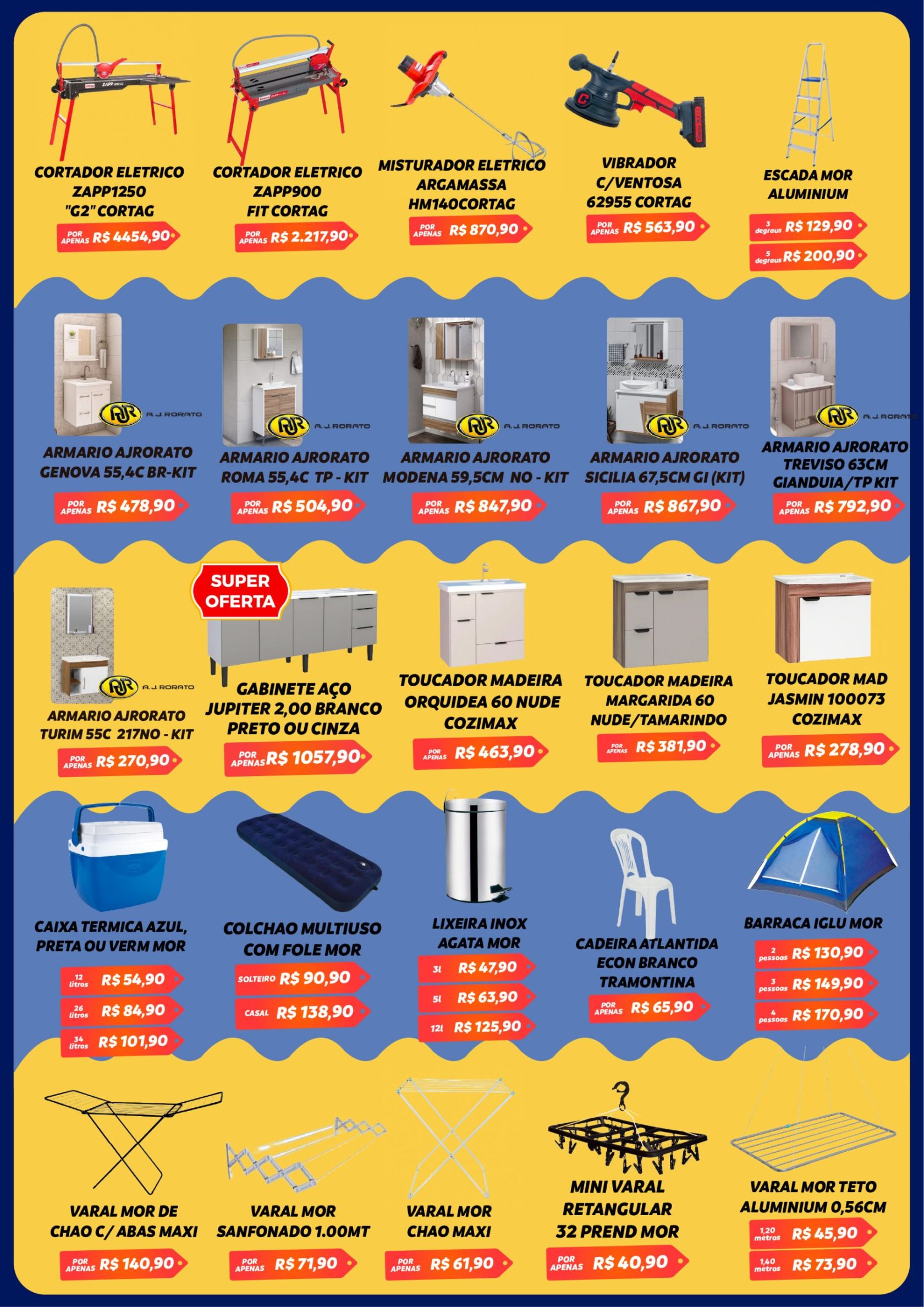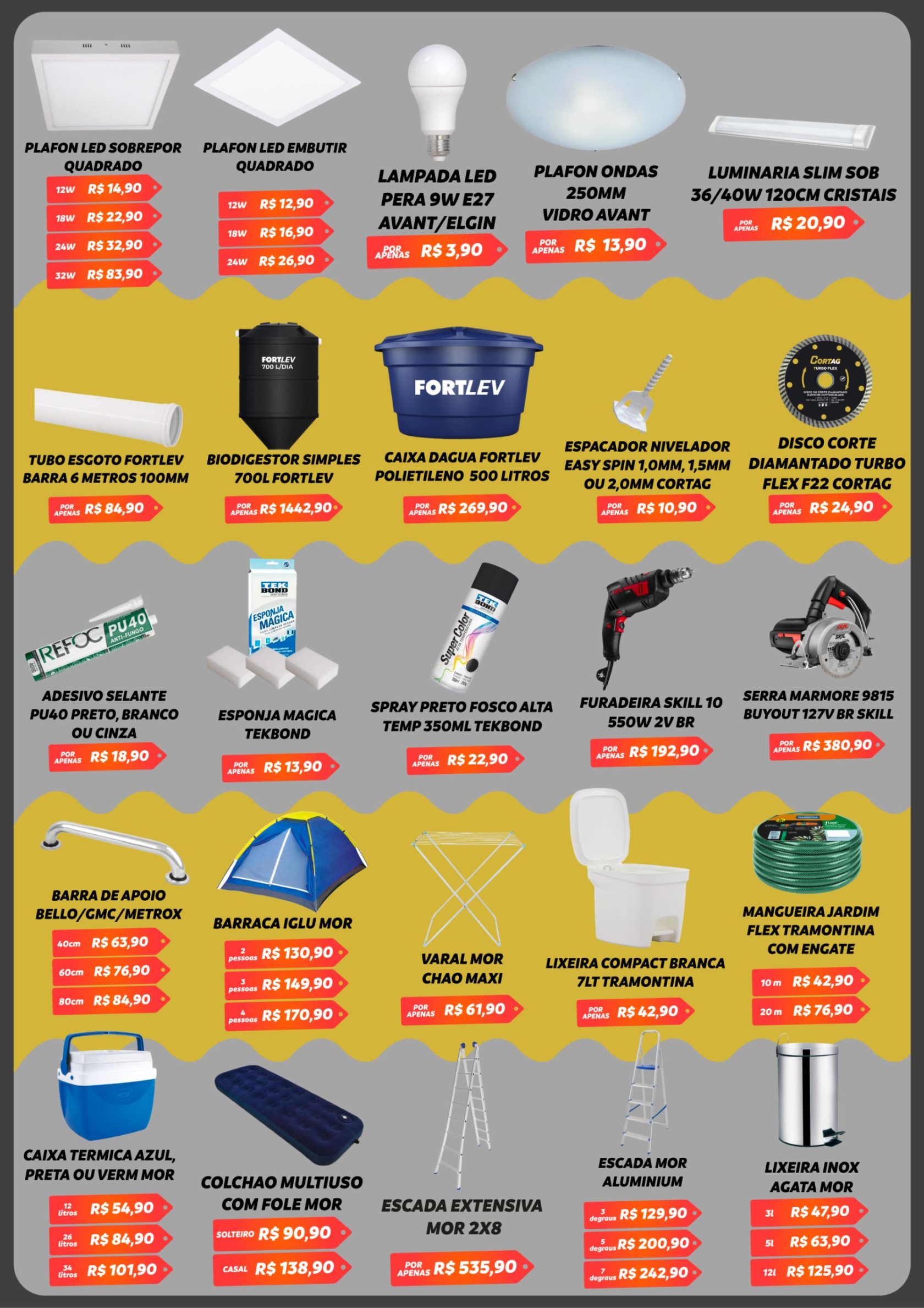 As nossas lojas, que somam 25.000 metros quadrados de área, disponibilizam o maior mix de materiais a pronta entrega da região, nos mais variados segmentos, como elétricos, iluminação, equipamentos de segurança, tinta, impermeabilizantes, pisos, porcelanatos, revestimentos, portas, janelas, hidráulicos, materiais brutos de construção, ferragens, ferramentas manuais e elétricas, jardinagem, lazer, cozinha, área de serviço, banheiro e organização da sua casa, tornando-se uma loja completa no segmento.